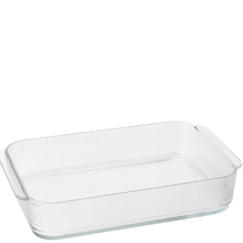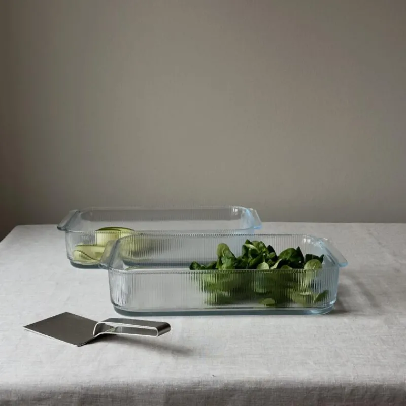 Der Entwurf der Pilastro-Servierschale von Stelton stammt vom Designer Francis Cayouette, sie zeichnet sich durch ihren Minimalismus und besondere Raffinesse aus. Durch ihre schlichte Form und das transparente Glas passt die Form zu allen Einrichtungen und anderen Geschirrserien, gleichzeitig ist sie sehr robust und vielseitig und ist spülmaschinen-, ofen-, gefrier- und mikrowellengeeignet. Sie besteht aus geriffeltem, durchsichtigem Glas, ist 33,1 cm lang und 20,7 cm breit.