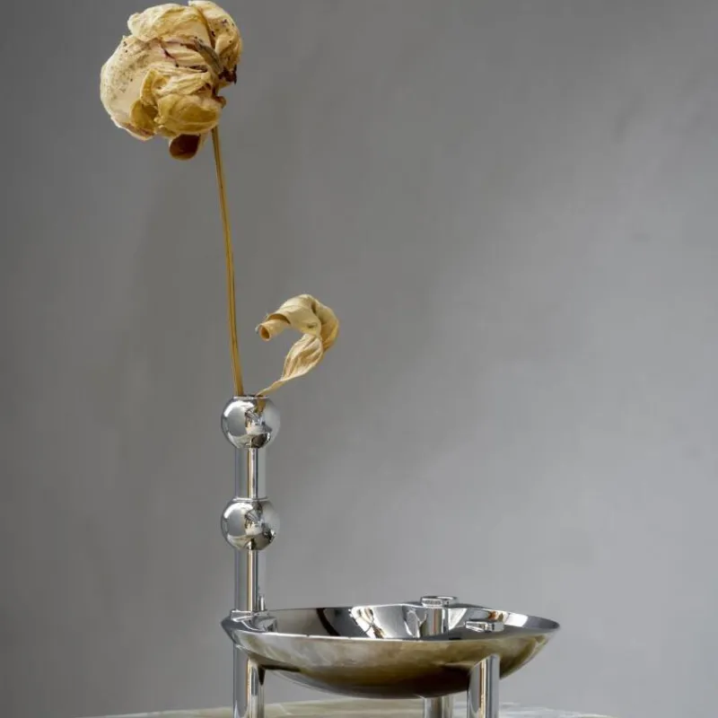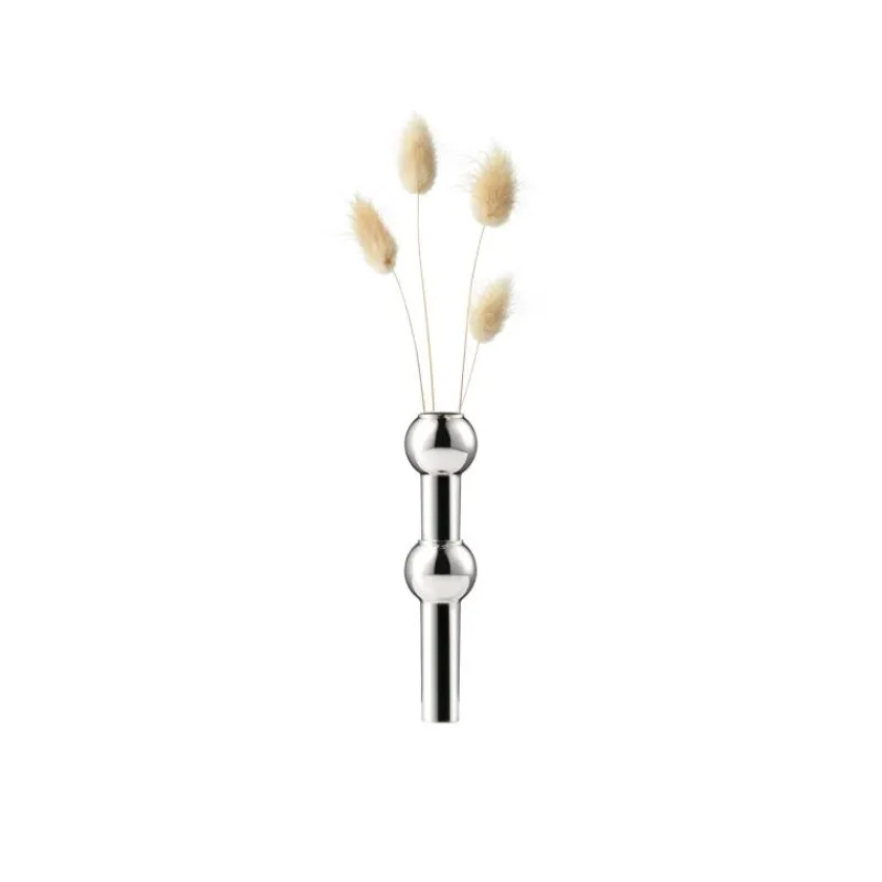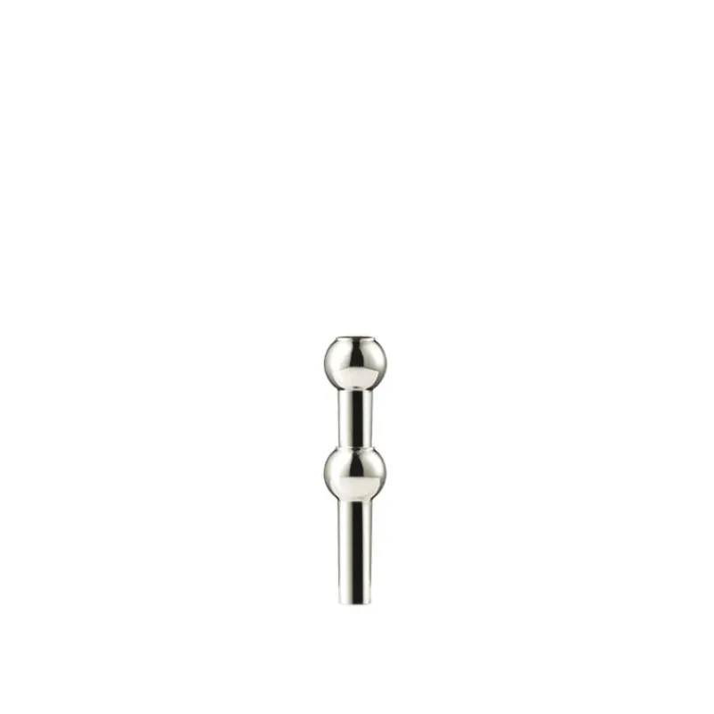 Der Kerzenhalter aus Chrom ist das Kernstück und die Ursprungsvariante des ikonischen Stoff Nagel Kerzenleuchters. Als Ergänzung dieses charakteristischen Klassikers wurde ein passender Aufsatz gestaltet, der als Vase für einzelne Blüten oder Zweige verwendet werden kann. So wird dem Kerzenleuchter eine ganz neue Dimension verliehen, indem er mit floralen Elementen beliebig erweitert werden kann. Es können sowohl frische als auch getrocknete Blüten verwendet werden. Der Vasenaufsatz besteht wie der Kerzenhalter aus einer vernickelten Zinklegierung, er ist 10 cm hoch und hat einen Durchmesser von 2,4 cm.