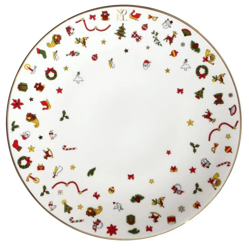 Dem verspielten Dekor der Serie Noel Oro mit tanzenden Schneeflocken, Sternen, Schneemännern und vielem weiteren liebevoll illustrierten Weihnachtsfiguren wird mit einem Faden aus reinem Gold am Rand ein Hauch von Luxus verliehen. Die modernen Formen der einzelnen Geschirrteile sorgen dafür, dass auf einer reich gedeckten Festtagstafel keine Wünsche mehr offen bleiben. Für alle, die die zauberhafte Magie von Weihnachten lieben, bietet Noel Oro ein goldenes Fest. Der flache Teller mit einem Durchmesser von 28 cm hat die Größe eines klassischen Esstellers und wird zum stilvollen Servieren von Hauptspeisen verwendet. Der Tellerrand ist ganz leicht nach oben geneigt, sodass Soßen oder andere Flüssigkeiten nicht auf den Tisch gelangen. Aufgrund der Verzierung mit 24-karätige Gold ist die Serie Noel Oro weder für die Spülmaschine noch für die Mikrowelle geeignet.