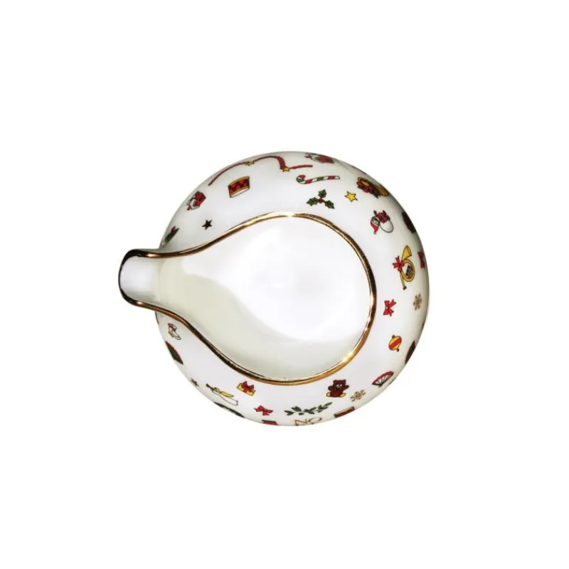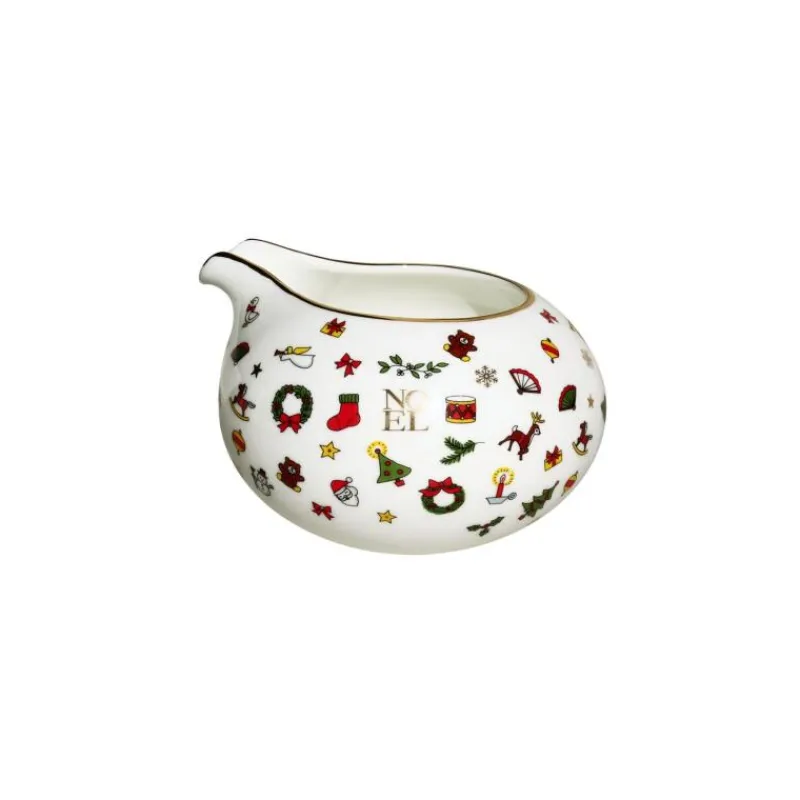 Dem verspielten Dekor der Serie Noel Oro mit tanzenden Schneeflocken, Sternen, Schneemännern und vielem weiteren liebevoll illustrierten Weihnachtsfiguren wird mit einem Faden aus reinem Gold am Rand ein Hauch von Luxus verliehen. Die modernen Formen der einzelnen Geschirrteile sorgen dafür, dass auf einer reich gedeckten Festtagstafel keine Wünsche mehr offen bleiben. Für alle, die die zauberhafte Magie von Weihnachten lieben, bietet Noel Oro ein goldenes Fest. Um seinen Gästen vorausschauend einen Schluck Milch zum Kaffee anbieten zu können, bietet sich das Classic Milchkännchen mit einem Fassungsvermögen von 250 ml an. Mit seiner runden Form passt es perfekt ins restliche Service. Aufgrund der Verzierung mit 24-karätige Gold ist die Serie Noel Oro weder für die Spülmaschine noch für die Mikrowelle geeignet.