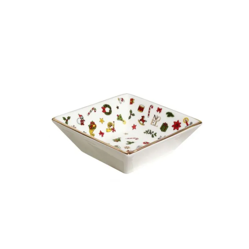 Dem verspielten Dekor der Serie Noel Oro mit tanzenden Schneeflocken, Sternen, Schneemännern und vielem weiteren liebevoll illustrierten Weihnachtsfiguren wird mit einem Faden aus reinem Gold am Rand ein Hauch von Luxus verliehen. Die modernen Formen der einzelnen Geschirrteile sorgen dafür, dass auf einer reich gedeckten Festtagstafel keine Wünsche mehr offen bleiben. Für alle, die die zauberhafte Magie von Weihnachten lieben, bietet Noel Oro ein goldenes Fest. Ob Obstsalat oder Tapas, kleine Desserts, Snacks oder passende Dips: mit der quadratischen Schale mit einer Seitenlänge von 9,5 cm können Sie köstliche Kleinigkeiten servieren und verspeisen. Von diesem kleinen Alleskönner kann man nie genug haben! Aufgrund der Verzierung mit 24-karätige Gold ist die Serie Noel Oro weder für die Spülmaschine noch für die Mikrowelle geeignet.