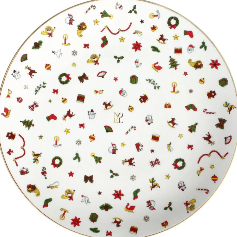 Dem verspielten Dekor der Serie Noel Oro mit tanzenden Schneeflocken, Sternen, Schneemännern und vielem weiteren liebevoll illustrierten Weihnachtsfiguren wird mit einem Faden aus reinem Gold am Rand ein Hauch von Luxus verliehen. Die modernen Formen der einzelnen Geschirrteile sorgen dafür, dass auf einer reich gedeckten Festtagstafel keine Wünsche mehr offen bleiben. Für alle, die die zauberhafte Magie von Weihnachten lieben, bietet Noel Oro ein goldenes Fest. Die runde Servierplatte mit einem Durchmesser von 31 cm richtet Speisen wie Braten, Fisch oder Kuchen ästhetisch und ansprechend an und serviert die Speisen auf einem exklusiven Untergrund. Aufgrund der Verzierung mit 24-karätige Gold ist die Serie Noel Oro weder für die Spülmaschine noch für die Mikrowelle geeignet.