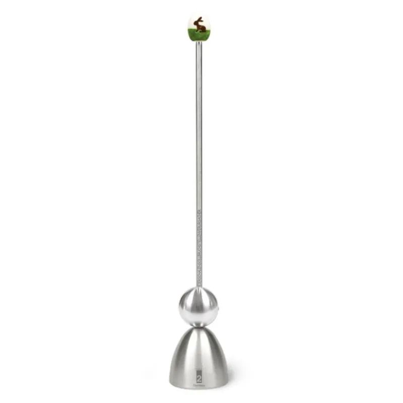 Der Eierschalensollbruchstellenverursacher Clack ist das perfekte Utensil für alle Liebhaber des Frühstückseis. Dieser praktische Helfer mit dem klangvollen Namen öffnet jedes Ei sauber und ordentlich, egal ob weich, mittel oder hart gekocht. Der Eieröffner Clack wird zunächst auf das Ei gesetzt, dann wird die Schlagkugel am Führungsstab nach oben geschoben und frei fallengelassen. Dadurch erhält die Eierschale eine ringförmige Bruchstelle. Nun lässt sich der Kopf des Eis ganz leicht mit einem Messer abheben. Die Öffnung des gekochten Eis mit dem Clack funktioniert mit einem kräftigen Stoß, daher sollte der Eieröffner nicht mit Eierbechern aus Porzellan genutzt werden. Der Eierschalensollbruchstellenverursacher Clack ist 24 cm hoch und hat einen Durchmesser von 4 cm. Er besteht aus Edelstahl, das Ei am oberen Ende ist aus Keramik gefertigt.