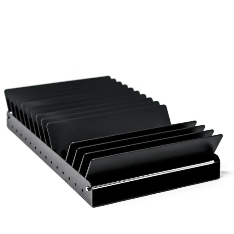 Mit dem DVD-Trägerkasten von USM lässt sich das Innenleben eines USM-Möbels auf funktionale Weise individualisieren. In dem Einsatz können bis zu 9 CDs archiviert und optisch ansprechend präsentiert werden. Die schwenkbaren Kunststoffplatten ermöglichen ein praktisches Durchblättern der DVDs und können nach eigenem Geschmack eingesetzt werden. Im Lieferumfang enthalten sind dabei 14 Kunststoff-Einsätze. Der Einsatz passt zu Ausziehtablaren, Ausziehtüren (Breite 75 cm) und Schubladen (Größe A6), kann aber auch frei stehend verwendet werden. Er ist 35 cm lang und 19,5 cm breit.