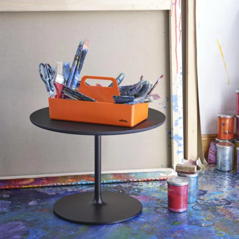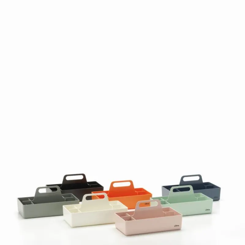 Die Toolbox von Vitra aus recyceltem Kunststoff ist ein praktisches Organisationswerkzeug: Arbeitsmaterialien, Badezimmeraccessoires und Küchenutensilien können darin verstaut und transportiert werden. Mit einem Handgriff lässt sich die Toolbox dann mitsamt ihrem Inhalt ins Regal oder in den Schrank räumen. In ihren verschieden großen Fächern lassen sich Utensilien unterschiedlichster Größe verstauen. Die Toolbox von Vitra wird so zum idealen Begleiter für flexible Einrichter. Das strahlende Orange der Toolbox ist die natürliche Farbe des verarbeiteten Recyclingwerkstoffes und kann darum kleinste Farbunregelmäßigkeiten aufweisen.