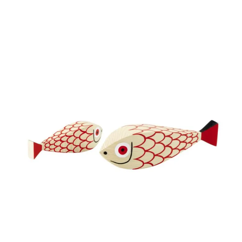 Rot geschuppt, ein friedvolles Mutter-Kind-Gespann aus dem Meer – die Wooden Doll Mother Fish and Child des US-Designers Alexander Girard berührt und schafft eine gute Atmosphäre. Sie gehört zu einer Reihe mal fröhlich dreinblickender, mal eher übellaunig aussehender Gruppe von Holzskulpturen, die allesamt durch ihre lebendige Gestaltung auffallen und bestechen. Von Hand erschaffen und bemalt stellt jedes Paar der Wooden Doll Mother Fish and Child, wie alle anderen Figuren der Wooden-Doll-Serie, ein in dieser Art einmaliges Objekt dar.