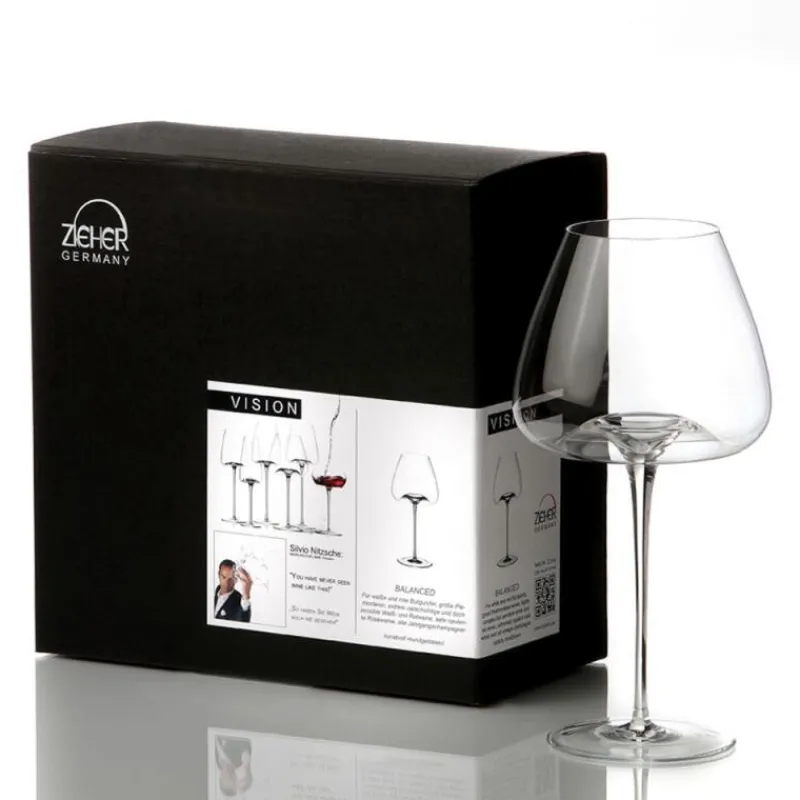 Das Unternehmen Zieher aus dem oberfränkischen Himmelkron steht für anspruchsvolle Gläser, moderne Geschirre und innovative Buffetsysteme im gehobenen Gastronomiebereich. In einer der weltweit besten Glasbläsereien entstehen auf traditionelle Weise gleichermaßen kunstvolle wie innovative Gläser aus bleifreiem Kristallglas. Die Serie Vision garantiert die optimale Entfaltung des Weins und sorgt für geschmackliche und visuelle Genussmomente. Spitzenköche und andere Top-Gastronomen schätzen die filigranen Gläser, die sich nicht als Weiß- oder Rotweingläser, sondern als Themen- und Charaktergläser präsentieren.